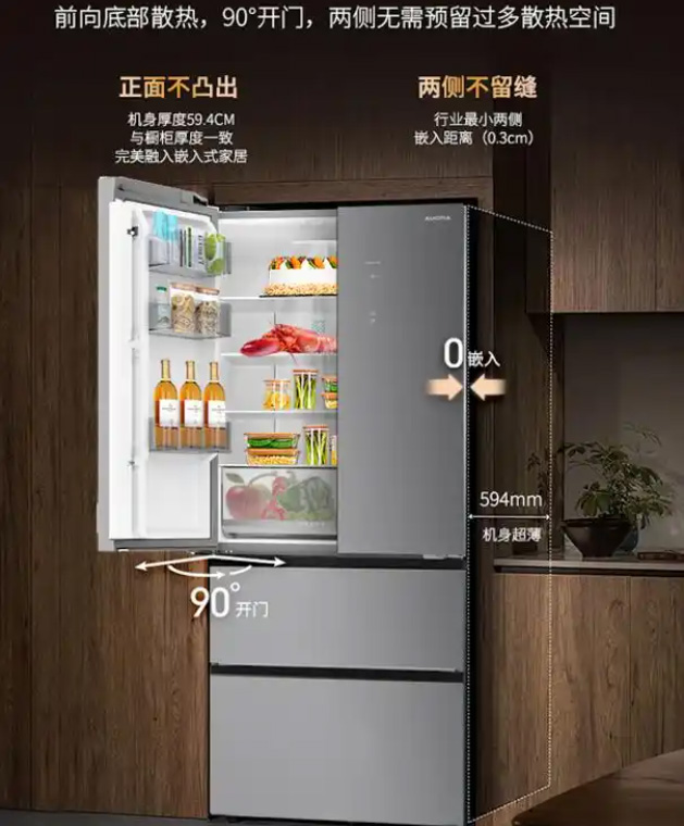 为更好匹配这一领创设计,这款冰箱在技术上采用了前向底置散热方式,释放更多空间。广角变轨铰链做到极限开门,自动悬停,实现开门不碰壁、推拉抽屉不受阻。以更小占地面积、更大储物容积、更高空间利用率,带来家庭全新使用体验。