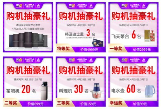 购机抽豪礼:购臻享型号消费者可参加澳柯玛4月28日、5月7日直播抽奖活动,畅游迪士尼,飞天茅台,澳柯玛茶吧机等大奖等你来拿!